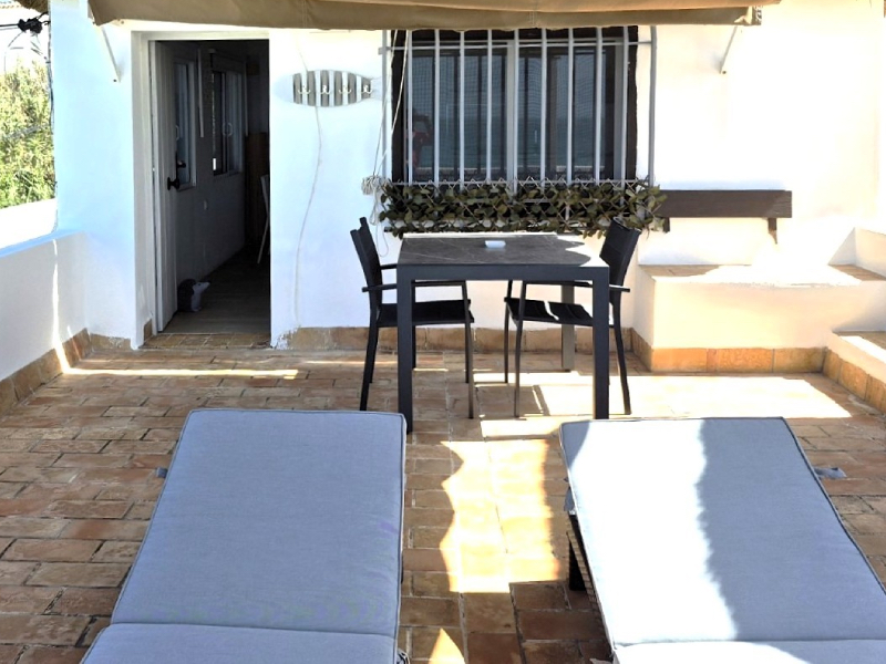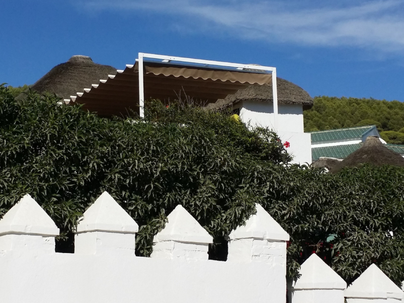 Disfruta su terraza de 20 metros cuadrados de uso privado, amueblada con: mesa, sillas, tumbonas, pérgola con toldo corredero, tendedero y lavapiés. La habitación y la terraza están en la planta alta. El acceso a la terraza es a través de escalera de caracol exterior. No se recomienda este bungalow a personas con problemas de movilidad.