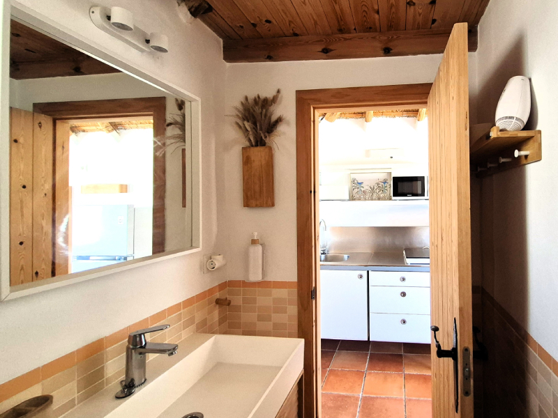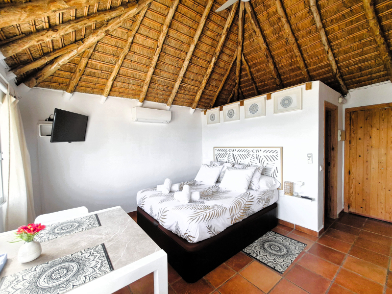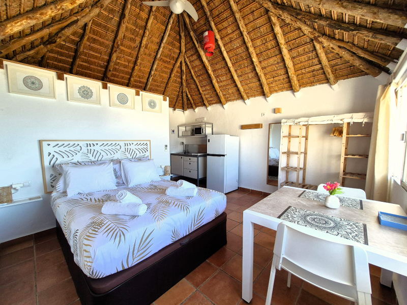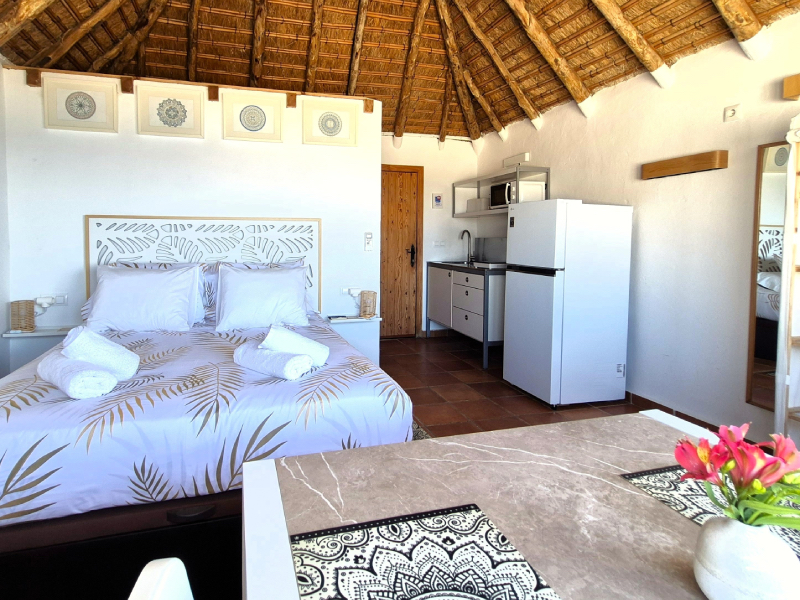 El bungalow tiene una habitación con baño y cocina dentro.